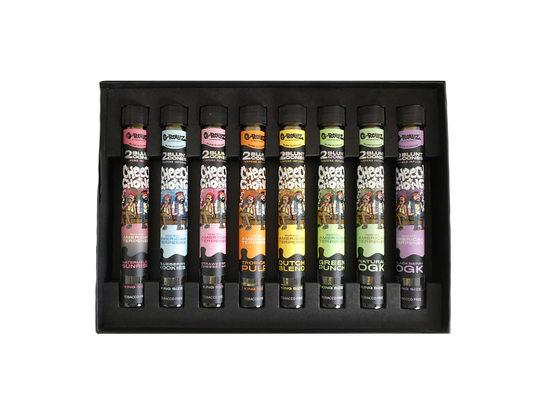 Inside the box you will find eight glass tubes, each containing two terpene-infused, hemp blunt cones.