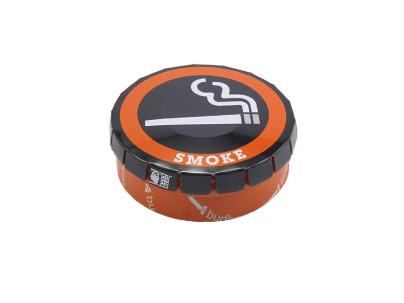 Small aluminium tin with click-top lid for storing snuff or small amounts of tobacco. Smoke design.
